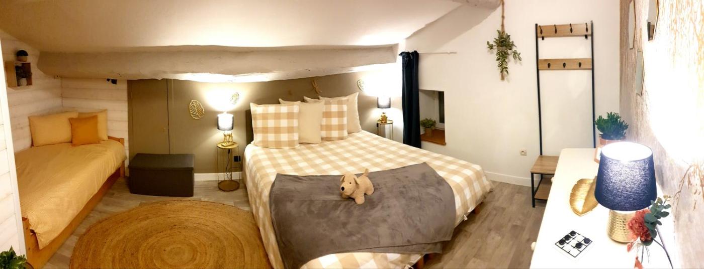 Chambre Double Familiale. The family room provides a private entrance, a tea and coffee maker, a terrace with garden views as well as a shared bathroom featuring a shower. The unit offers 3 beds. ;